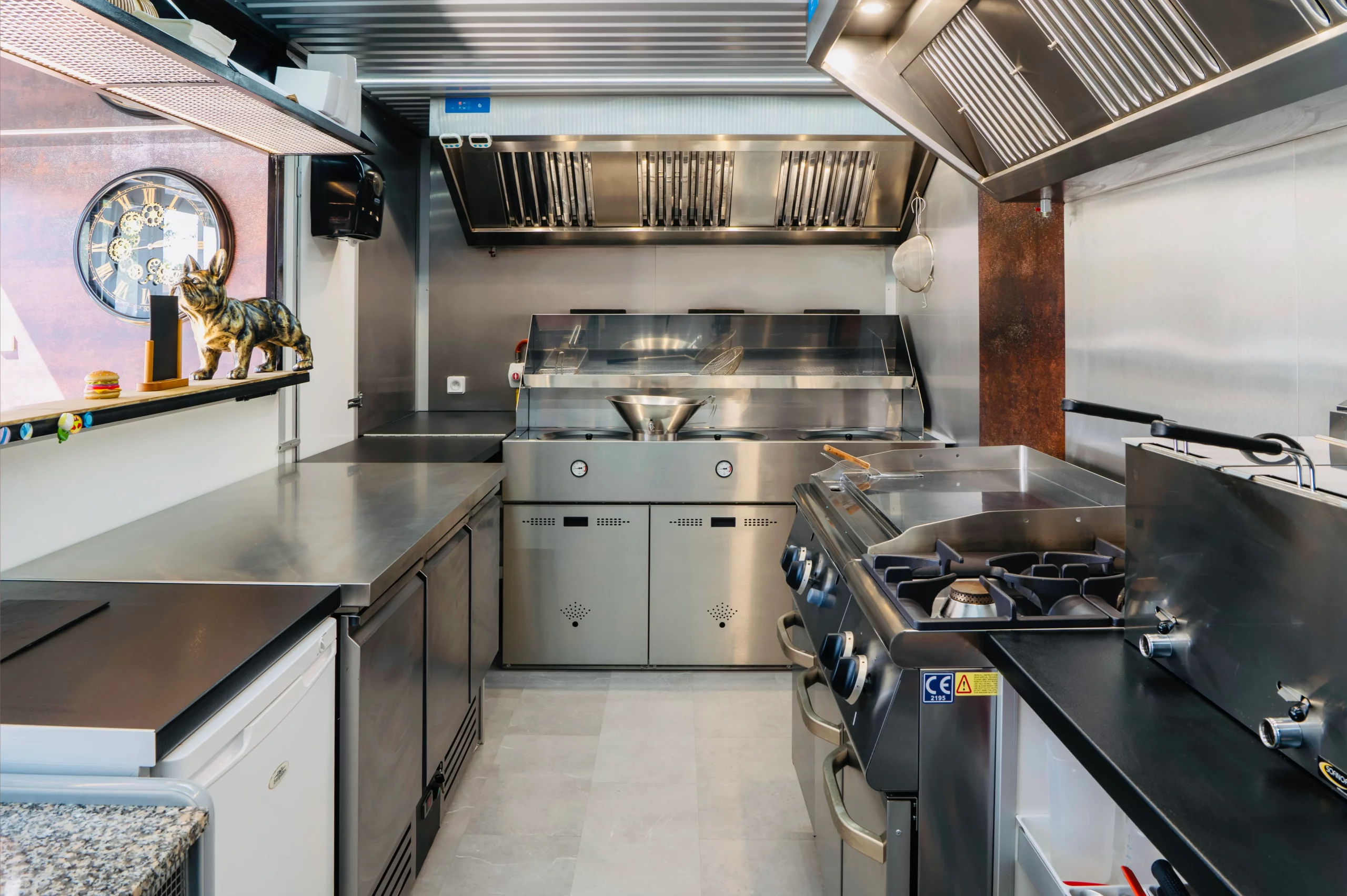 L’organisation de l’espace de travail du container burger et ses équipements sont prévus et adaptés à cette activité. Les équipements spécifiques aux burgers sont sélectionnés pour leur capacité à « envoyer », leur endurance et facilité d’entretien.