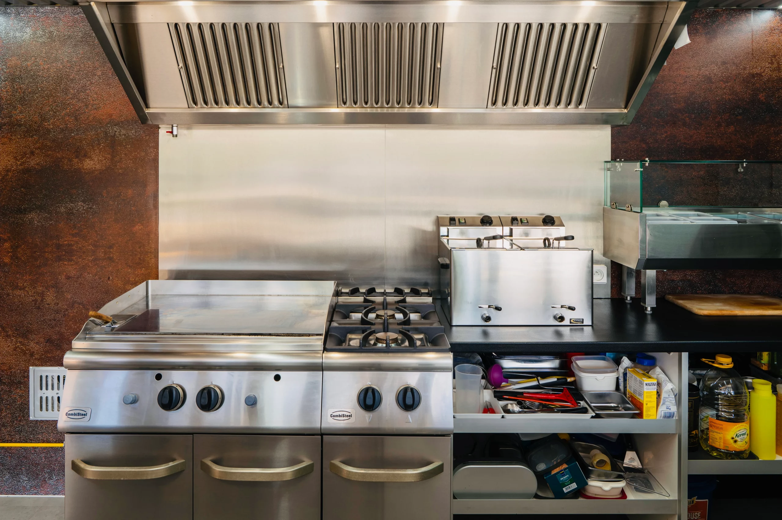 20 ans d’expérience de restaurateur nous a permis au fil du temps de sélectionner nombre de fabricants pour leur qualité, leur sérieux dans la fabrication de tout le matériel nécessaire dans une cuisine. Les différentes hottes d’extractions obligatoires en cuisine, avec ou sans tourelle extérieure n’ont plus de secrets pour nous et nos partenaires fabricants nous fournissent des systèmes d’extraction sur mesure en fonction de chaque type d’activité (friterie, burger, snack, pizza, etc..) Le matériel sous la hotte de type plancha, friteuse, feux vifs, fours sera adapté à votre carte et votre accès à l’Energie (Gaz ou Électricité). Tout comme l’ensemble froid de type meuble froid positif, meuble froid négatif, saladette, chambre froide positive, chambre froide négative, armoire frigo, armoire congélateur, vitrine boissons, vitrine présentation froide ou chaude….tout est envisageable et sera adapté par nos équipes de pros en fonction de vos besoins et de vos budgets. L’ensemble est toujours uniforme esthétiquement et agencé pour un fonctionnement optimal par notre Bureau d’Études en accord avec vos envies.